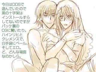 今日は代休だったので、なんばまで足を伸ばしメッセまで出掛けました。目当ては「黒の十字架」。無事特典付きを購入。ついでに他の店にも行って、「クラフトソード2」を予約。「東京魔人學園外法帖血風録」と「九龍妖魔學園紀」も予約しようかと思ったんですが、初回版のごついのと限定版のごついのしか予約受け付けなし。最初はそっちを買う気だったけどあまりにもかさ張りそうな案配なので通常版でいいや、と思い直し。当日買いに行く事にしました。で、ついでに中を見ていたら、やっぱりDDSが欲しくなって、気がつくと買っていました。あははーー。メモカもDDS仕様です。おまけに薄い小冊子と告知ポスターを貰っていました。小冊子は嬉しいけどポスター……。