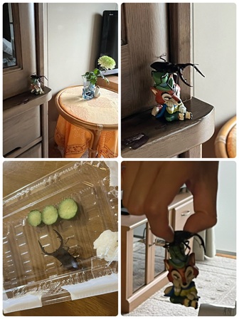 今朝、玄関に置いておいたクワガタは脱走していました。 桃は周囲を念入りに探していましたが見つからず。 そんな様子を横目に、 あたしは昨日来た桜に用意した箸置きや、 ランチョンマットを片付けようと、 居間の食器棚に向かおうとしたところ、 い、い、いましたーーーーー。