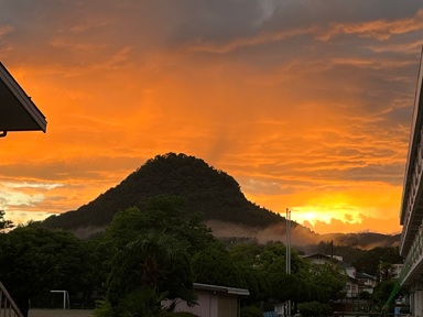 バド練に行くとき、 西の空が茜色に染まっていました。 梅雨真っ只中の時節、 今週は雨が降ったりやんだりと思いきや、 日差しが出ることもあり、 安定しない様々な表情の空模様でした。 明日から三日間ほど天気が良いようで、 それを確信させるかのような夕焼け。 思わず、体育館に入る前にパシャリ。