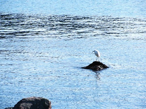 海辺の公園に近づいたら浅瀬の岩に鳥を見つけた サギの仲間かな...