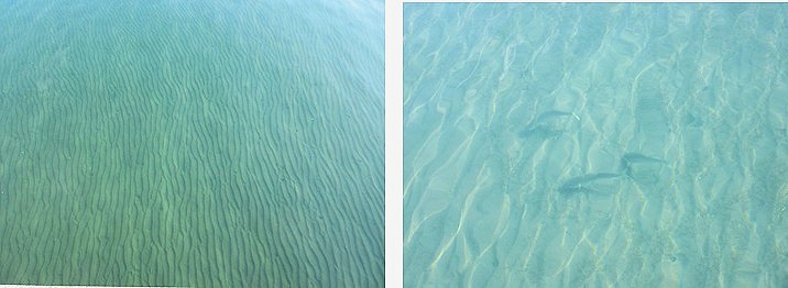 桟橋みたいな場所で海面を覗く... 水が澄んでいて今日は海底の砂の波模様迄綺麗に見えた。 良く見ると手のひらほどの大きさの魚が泳いでる... サギは魚を狙っているのか。