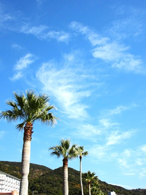 歩き出して公園の中を2週... ヤシノ木が並ぶこの場所は空を見上げるのが好きな場所 時々このアングルで撮って日記にUPしているけど、季節によって違う空の色と雲の形を見比べるのも好きな作業。