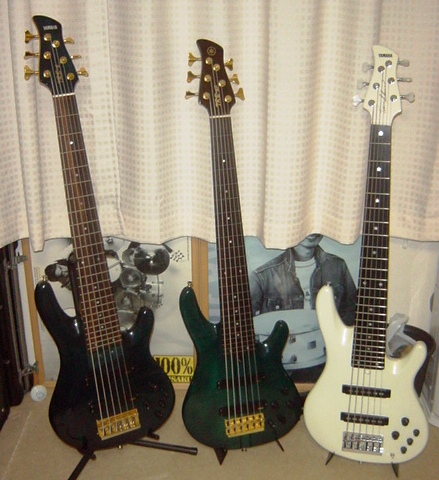 来年はこの3本をフルに使うようなライヴをもくろんでます。 なぜ同じようなのを?と思った方に少々解説。 左は普通のフレッテド。 真ん中はフレットレス。(共に開放弦チューニングは上からCGDAEB) 右の白はピッコロチューニング(上から同じくFCGDAE)一番細いFの弦はギターのA弦(太さ24)で代用。普通に売ってないので。