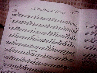 こんな感じでコード譜+アルファの譜面をメンバーに渡してるのです (結構いいかげんなとこあるが) バンマスが、ただCD渡して「これやるよ」だとメンバー大変ですよ、たぶん 聴き取る時間あればその分個人練習してもらえるしね インストバンド2つのバンマスやるからには これくらいしないと、と思ってがんばってます