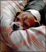 工事の方は早朝9時位との事で叩き起こされました。枕片手に階下へ。姉弟&犬は一階へ閉じ込められてしまいました。弟は既にグースカピーと寝ております。工事の方がやって参りました。犬が騒ぎ始めました。寝させて…下さい。 アォーンアォーン!!!アォォォォォーーーーーン!!!!! ビーグル犬の鳴き声は森の鈴と呼ばれている程恐ろしく甲高く声が響きます。鈴なんて可愛らしい物じゃあありません。例えるならば…。○翼の拡声器?(恐らく森の鈴と命名されたのは中世エウロッパ。当時そんな物は無かったので仕方無いのですが…。)寝させて…下さい。戸を必死で開けようとカリカリカリカリ掻きむしります。………。寝させて…下さい。そうして…網戸を突き破って外へ脱出。 脱出したは良いけれど中に入れないので(馬鹿。)ションボリ顔。×2度。背中が真っ黒なので滅茶苦茶熱くなっております。もーーー!!!頼むから寝させてくれろー!!! 夢の中でも犬の暴れを止めておりました。チカレタビー!!!