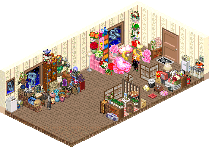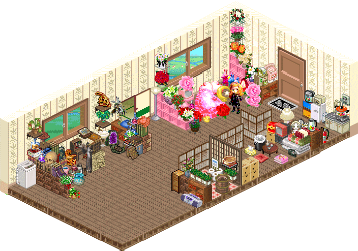 一つの部屋に設置出来るアイテムの限界数は300個なのですがキッチリ300個置き切ってしまいました。 下宿となっております。厨房・便所・風呂・洗濯場兼用。 ファンシー好き・魔法使い・凡百の民が居住しております。左隅は倉庫。 ● ファンシールーム ○ 6%dokidokiなイメージです。 ● 魔法使いルーム ○ 色々な物をゴチャゴチャ設置してみました。それっぽく見えるかな?この部分に一番アイテム数を裂いております。沙耶と上級天使がいるよ! ● 凡百の民ルーム ○ 本当はネットゲ廃人ルームか犯罪者ルームにしたかったのですがパソコンが手に入らない上アイテム数の限界により断念…。 学校の机と椅子がようやく手に入ったので(椅子がなっかなか手に入らず参りました。)無理矢理設置してみました。倫理的に問題のあるジョークをかましてみたりして…。 ● 倉庫部分 ○ オフィシャルアイテム【フタリノイーザイス】背もたれがハート形の椅子がそうです。コレピク内唯一のオカルト系アイテムなので絶対欲しかった逸品!