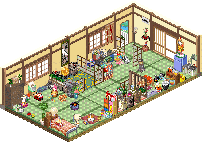 ● 不人気大爆発自作アイテム紹介(画面上部から。)基本的に全て3ピクにて販売しております。 ○ 牛乳 冷蔵庫の上に注目!不人気。 ○ 古めかしいガラス戸 パーツ系アイテムに初挑戦!3パーツで構成されております。和風のお部屋に良く合うと思うので是非!(必死!) ○ 貰った手紙 手紙の山です。 ○ 貰った名刺 名刺の山です。 ○ 釣り餌 小二個セット。小五個セットや大瓶・空瓶もあるよ。 ○ 浮き 釣りに使う浮きです。(もっと気の利いた説明をしろって?) ○ フィッシング・タイガー 青い表紙の本。釣りの本です。不人気。 ○ 映画・ドラゴン 茶色い表紙の本。映画の本です。不人気。 ○ 袴田さんの日記 テレビの横の机の上のノート(なのです。)の山です。 ○ プレゼントボックス 可愛いタンスの上に注目! ○ タイル ドラム缶風呂の床に注目! ○ 居候 ビーグル犬です。寝てます。たまに起きます。 ○ 呪われた袴田さん人形 2パーツで構成されております。下を上に重ねると呪われます。しかし呪われた袴田さん人形は他の商品よりも1ピク高い為全く売れず…。何故1ピク高いのかと言うと不吉な数字4ピクにしたかったからです。違う意味で不吉な商品になっちまいましたが! ○ 擬人化袴田さん人形 袴田さんが42歳の親父って事は分かってます。分かってます。余りにも不人気な為現在販売しておりません。欲しい方はご一報を!全色あるよ!(ここ苦笑いをする所。)1ピクで販売します。エ?ただでよこせ?…そうね。 ○ 手荷物 薬箱の前に注目。最近売れ無ェー。 ○ ごはん皿セット 1ピクなので買って下さい。やっぱり不人気。