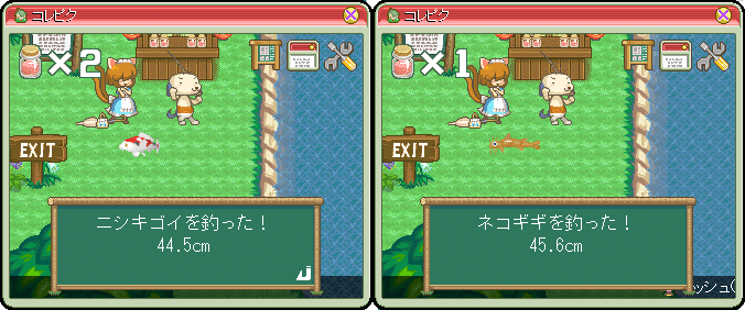 【コレピクナンバンズ】 三回目!よっしゃ来い! 三等当選でした。ライティングディスク。可愛いです。 当選した景品は宝箱に詰められて渡されます。現在の宝箱の数は100個以上。何故ならば連続して空けるとPCがフリーズ→強制終了→際起動をしないとアプリケーションが起動しなくなってしまうので開けられ無ェー。 釣り!釣り馬鹿の証が釣れました。ヤッター!簡単そうな形の沼の日に頑張ります!何と二つ釣れたので一つは飾る事にしました。