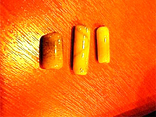 ……やっぱりチクワでした。って言うか思っっていたよりもチクワでした。コリャ無ェよ!状態。しかしながら欲しいと言って下さる心優しき方がいたので一つ交換して頂きました。(綺麗な形のトンボ玉と……) 分かり辛いので比較例!(右の写真参照!) 黄色いのが自作!左から自前のアクセサリー(結構なお値段でガラス玉一個で何でこんなにするんだ?!と謎めいていたのですが大理解!)・先生作・チクワと交換して下さった心優しき方作。(何と処女作)左の写真より右の写真の色の方が正しいです。黒い模様は火の加減を間違えた為スス混入。小型チクワに入っている謎の線はひび割れです。参った? ……もしかして向いてない?! で! 今週は水玉模様のトンボ玉に挑戦だッ!……。溶けたガラスがバーナーの噴射口(?)を塞いでしまい真っ青に!ヒーヒー! 失敗した溶けたガラスを巻くトンボ玉の軸になる針金を洗っていたのですが溶けて固まったガラスの破片が固まっていたので強引に手の力ではがそうと頑張りました。 ……良く考えたらガラスの破片なのですよね。当然のように指が血まみれに! 必死こいて指の力で血を止めていたのですがあっさり先生にバレる。治療して頂きました……〓■●_何やってんだろう……。しかしながら先生は可愛い!お洒落!一寸得した気分になりました!グヘヘ……。 今回は……チクワ+異次元の色彩……〓■●_ 家族に完成した物を見せる→爆笑を喰らう。