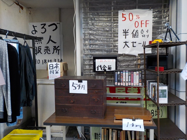 シャッターの閉まったビルの前によろづ無人販売所が。