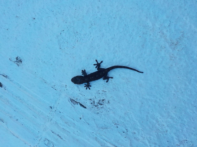 階段に生まれたばかりっぽい小さなヤモリ?がいた。