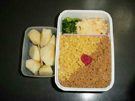 きのう(鶏肉と卵のそぼろご飯・鮭のグラタン・チンゲンサイの煮物・りんご)
