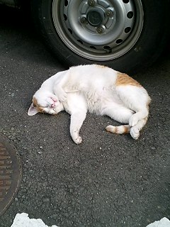 それがですね、今日はあまりにも朝から暑いもんで ものすごい寝相で道路に寝っころがっていたんです。