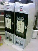 これが噂のスリッパタワー タワーの上部から・・・スリッパを投入して・・・ 真ん中にあるピンク色のボタンを押すことにより タワー下部より・・・殺菌済みのスリッパが一足ずつ出てくる仕組みだ