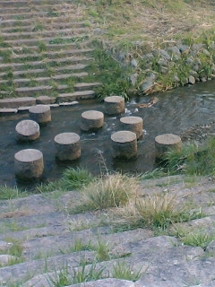 向こう岸へ行くには・・・ すぐ近くにきちんとした橋がある でも、このドキドキ石は魅力的だろ