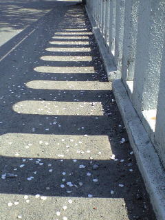 写真は・・・日曜朝に撮影したものだ 花びらが・・・橋の上に既に落ちている 満開と散り始めの丁度境目みたいな感じだった