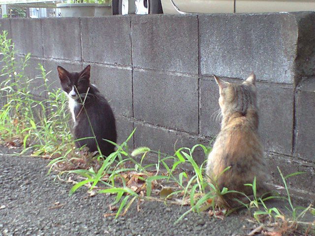 しばらく見詰め合ったあと、少し近づいたら逃げそうだったから じわじわと一気に逃げられないように近寄ってみた 行ってみると驚いたことに、猫はこいつだけじゃなくて 他にもわらわらとわいてきた