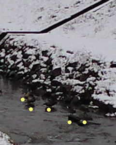 よく見ると、カモ吉や鳥がいる 拡大してみたけれど 保護色だから全然わからない 奥にカモ吉3羽、手前に茶色い鳥二羽