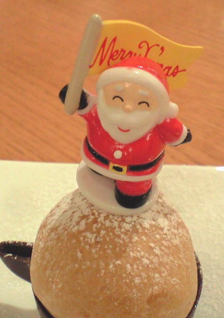 オードブルの冷製は蒸し牡蠣と真鯛のナントカ 普段目にしない着飾った盛り方に既にここで冷静さなぞ吹っ飛んで なんたらかんたらのうまそうなポタージュスープがあって 目の前で調理盛りわけしてくれるシェフが説明してくれたけれどスープ飲んだら食えないからパスして 直径50センチはあろうかというどでかいチーズの上で絡めて和えるトマトのパスタとか、ぺらぺら生地のナントカピザとかグラタンだとか ローストビーフの切り分けシェフの横からは和食コーナーが現れて 刺身どーん 蟹どーん 天麩羅どーん みんな板さんが、どーんどーんどーん で、何故だか和の食材でクリスマスのプレートが作られていて サンタの周りに和食のつまみが8種類 鍋料理も三種類あって、かぶの入った鯛の鍋と真っ赤で辛そうな鍋と、俺の好きな貝が入ったブイヤベース それぞれ一人前の小さな鍋を席で固形燃料で温かいまま食べられて 中華のコーナーではフカひれのナントカだの海老の餃子?だの飲茶いろいろに、何かを炒めておこげと一緒にあんかけがかかっているのだの 俺の大好きな海老がなにやらうまいソースに絡まってるのだの それからスモークチキンに寿司コーナーと、茶碗蒸しもあったような