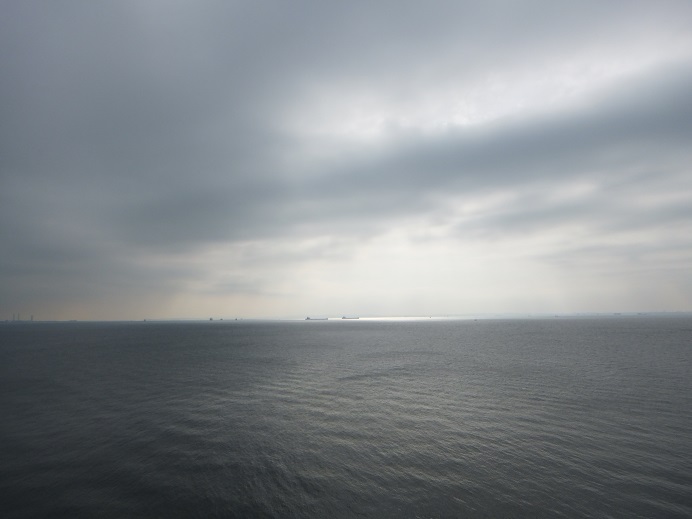 帰り道は、初の海ほたる アクアラインは東京湾を通る その橋とトンネルの道があるおかげで、本当に千葉が近くなったのだと思う でも、海ほたるは単なるサービスエリアではなく観光地化しているからか、海ほたるに入るために大渋滞 それでも、待ったおかげで、この海を眺めることができた