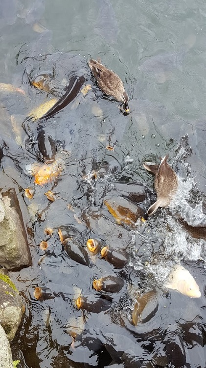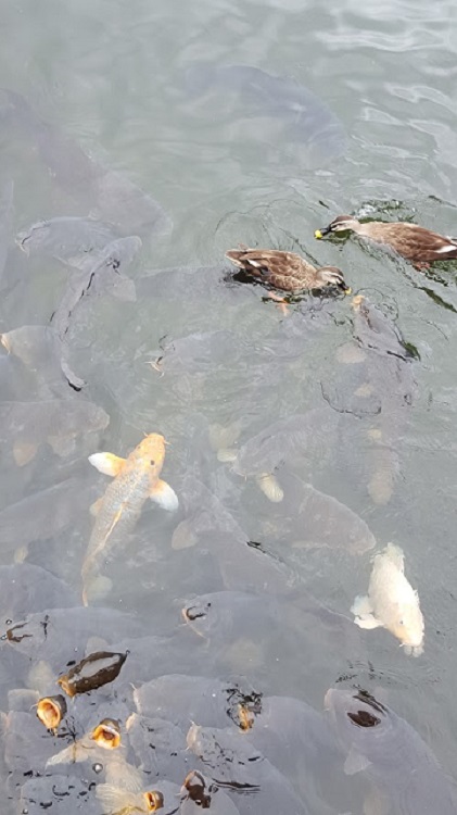かなりの数、そしてかなりの大きさの鯉吉 悠々と泳ぐ鯉吉は、水際に人が近づくと寄ってきて・・・ そう、エサをくれる人を待っているってわけだ