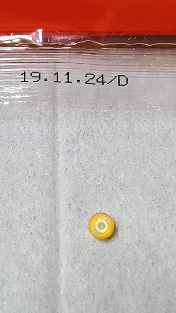 というわけで、先週金曜日だったか、す漬けイカを食べながらビールをグイグイやっていたところ、口の中でガリっというか、ボリッというか、とにかく硬いものが歯に当たった 思わず吐き出してみると、丸い、なんか、変なものが出てきた なんだろう、よくよく見ると、プラスチック?