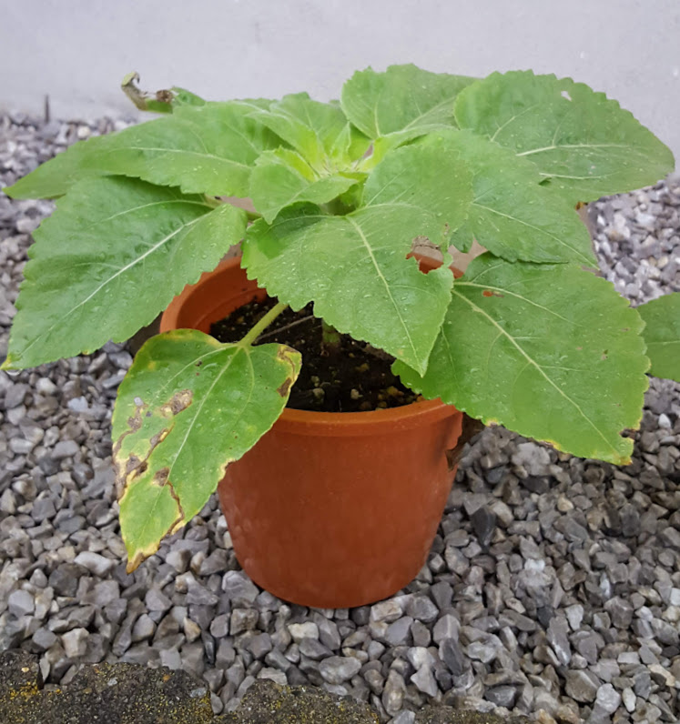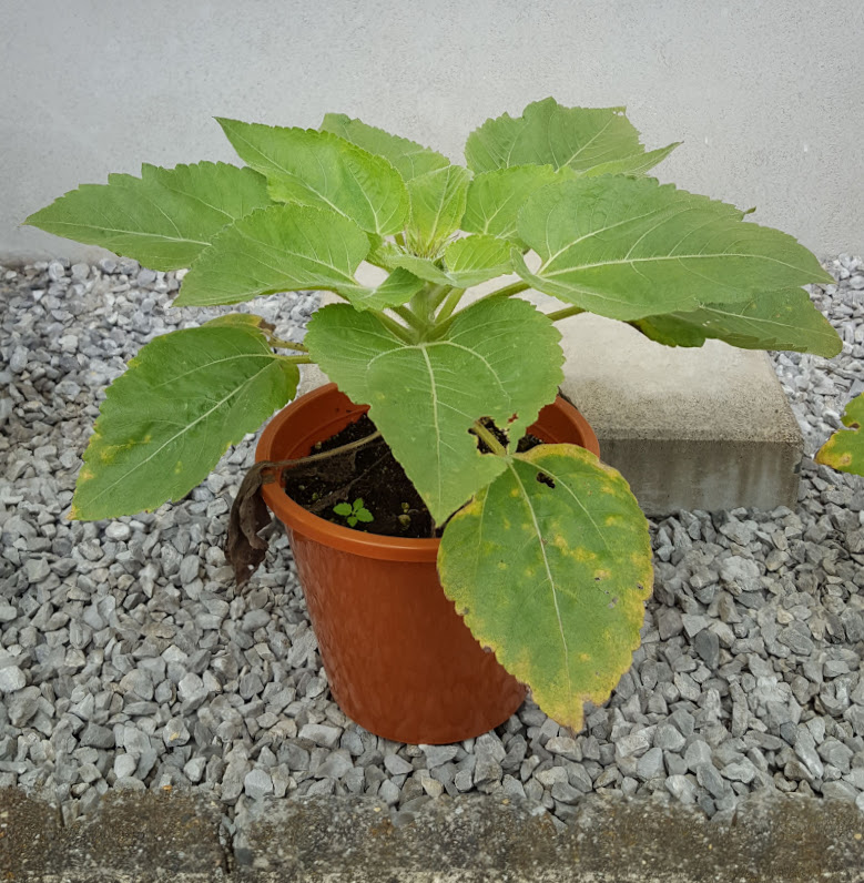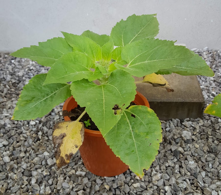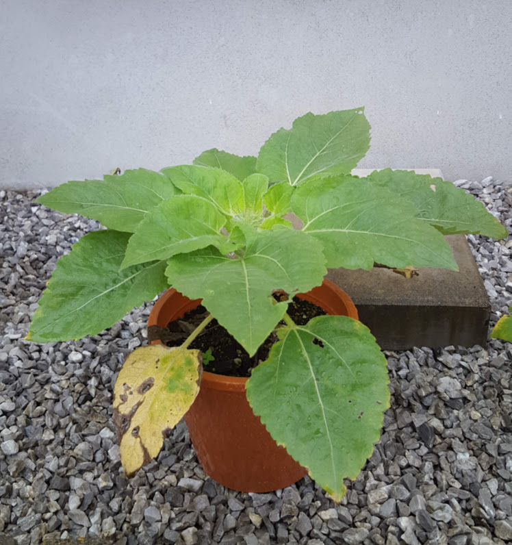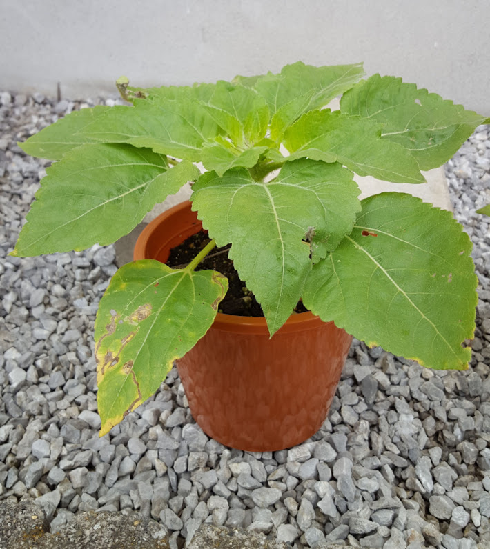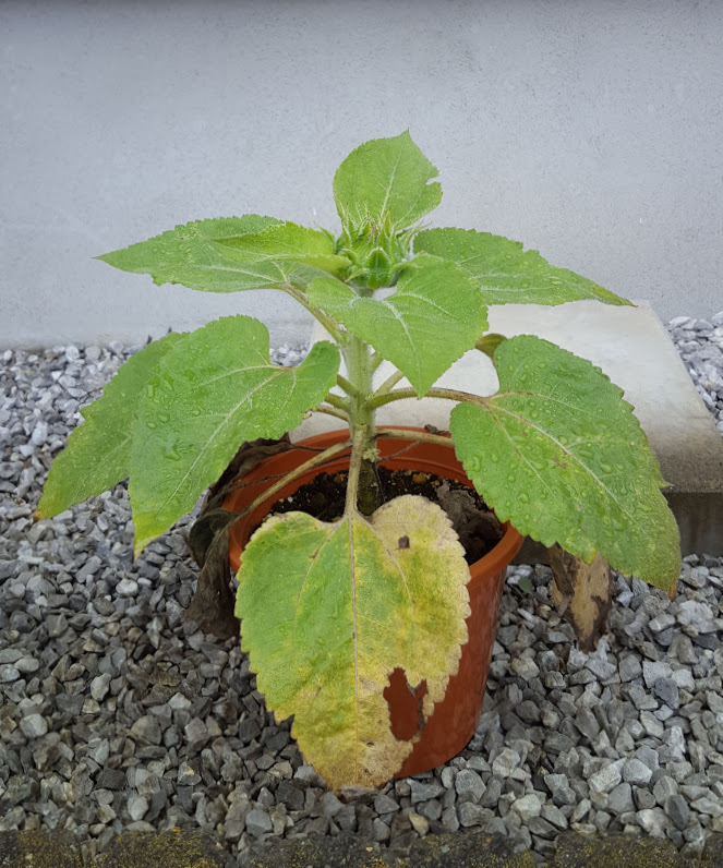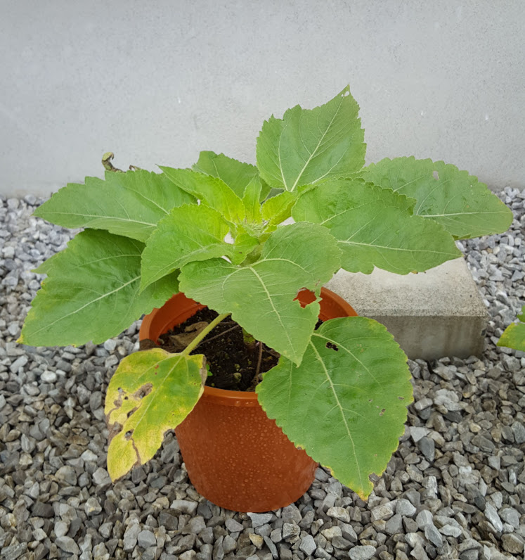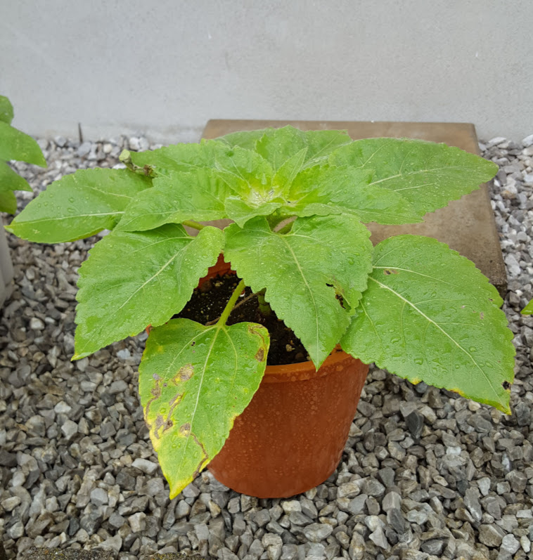 葉っぱくんは、下の方の葉っぱが黄色くなって枯れてしまう 園芸部に肥料不足を指摘され肥料を与えるようにしているけれど、どうも黄色くなる ずっと雨が降っているから水不足は心配ないと思うのだが、今度は日照不足なのだろうか