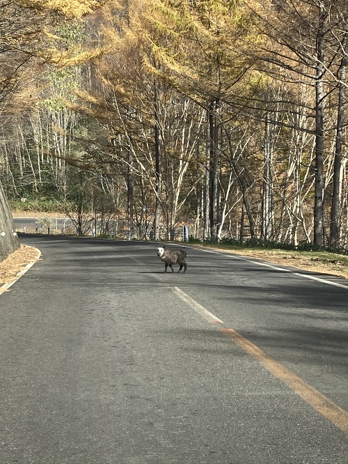カメラ目線でこっちを見ているのは、ニホンカモシカ? 天然記念物らしい、堂々としたもので車を怖がったりはしない模様 でも、考えてみれば、万座温泉へ来る車は限られていて、カモシカにも慣れているから轢かれたりしないんだろうな
