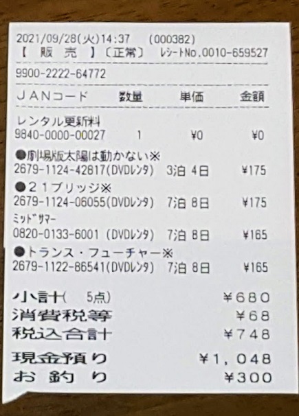 今日はレンタル店に行ってみようかと思う で、レンタル会員カードを出したら、期限が2020年4月26日で笑ってしまった コロナの流行りでレンタルのDVDがなんというか誰が触ったかわからない恐怖があって遠のいていた 配信にすればいいのに・・・と思うだろ? 俺もそう思うのだが、配信のサイトで様々な映画の紹介を見ていると、それだけで腹いっぱいになってしまう なんでだろう レンタル店にいて現物のDVDを手にした時の期待感は感じられずに、映像をもう見終えたみたいな感じになってしまう きっと情報が多すぎるんだな