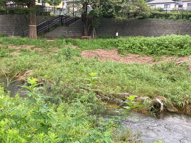 いつも歩いている歩道は、思う存分水没していたらしい 本当に川が増水しているときは見に行かなかったから、実際どの程度なのかは想像だけれど、この写真の土手の茶色い部分は流されてきた草木 後ろに見えるベンチのあたりはギリギリセーフだった模様 ただし、俺が立っている方、つまり写真の対岸は歩道が壊滅的になって、様々なものがたくさん流れ着いていた その写真はまるで被災地のようで撮影したくなかったから対岸の様子だけアップしておく