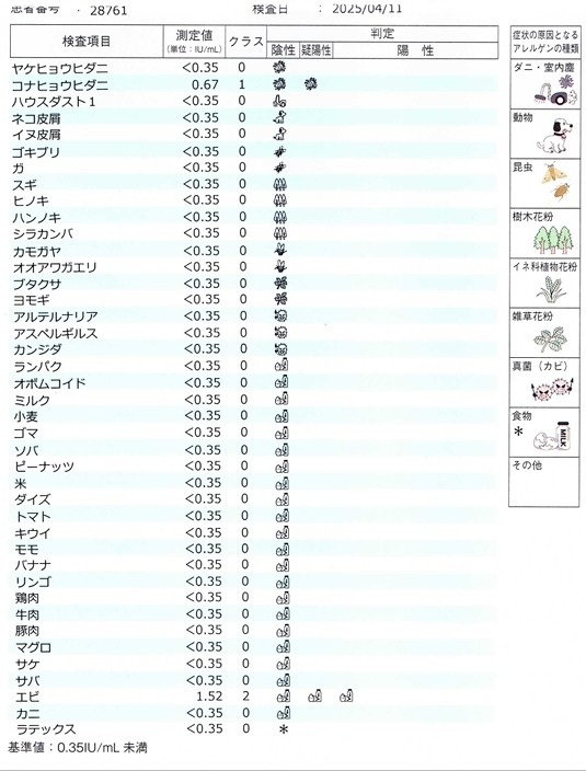 エビ・・・大好物はアレルギーになるって本当だったんだ あまり食べないように気を付けよう 他は全く陰性だった模様 でも、杉の時期から本当に反応するのは何故だろう(謎)