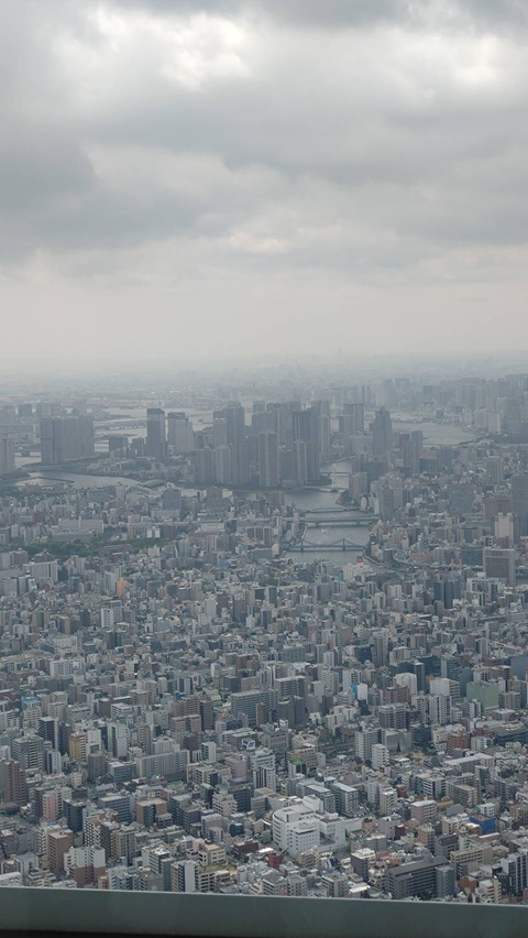 これが、天望回廊から眺めた東京 俺は写真を撮るために窓に寄ることもできなかったから、一緒に遠足に行ったバイト仲間に転送してもらった だから、撮影はなんかのスマホ 機種が違うから写真も違うのだけれど、高い ちょっと角度の変化があるような気もする 場所は、隅田川?だろうか、なんか川が見える