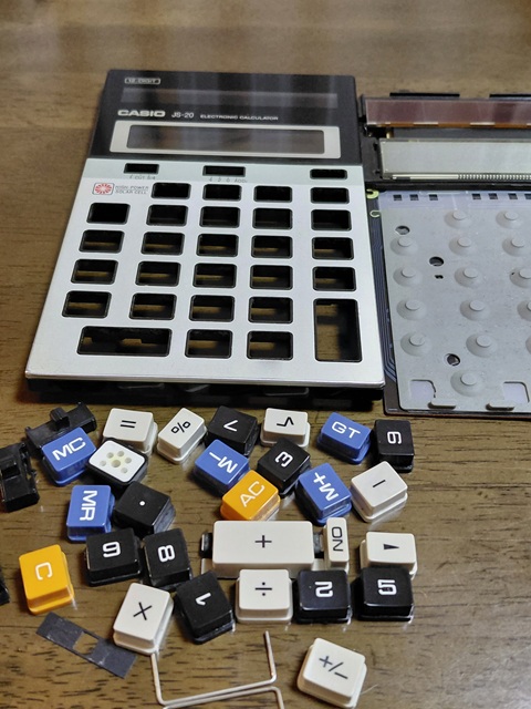 え? ボタンって、外れるのか? そうだよな、押せるんだから接着されているわけではないと気付く 見ごとにバラバラになった数字キー等々をまえに、しばし茫然 でも、長年世話になった電卓だから、ばらばらで捨てるのは忍びない