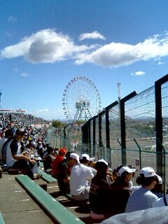 と言うわけで、鈴鹿に行って帰ってきました。右の写真は、私が座ったカシオトライアングル(シケイン)に常設してある観戦席から最終コーナー付近を撮ったものです。写真でははっきり写ってませんが、実は観覧車の左横付近に、中部国際空港らしきものが見えてました。7日は恐ろしく天気が良く、しかも大気が澄んでいた為、知多半島が丸見え。綺麗でしたよー。