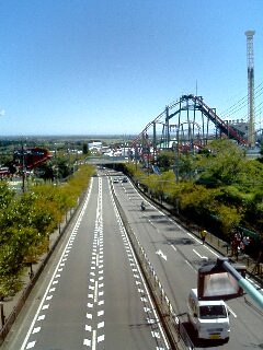 写真は、鈴鹿サーキットランドの間を通る道路上にかかる陸橋の上から、伊勢湾、知多半島方面を写したものです。 いわゆる『鈴鹿サーキット』は向かって右側にあります。鈴鹿は、レーシングコースの他に、遊園地や自動車教習所、ホテル、レストラン、果てには温泉施設まで揃った、レジャーランドなのですね。サーキット遊園地なので、アトラクションは乗り物が主体で、ありとあらゆるゴーカートがありますが、やはり圧巻はサーキットそのものを走ることができるゴーカートです。一度だけ乗ったことがありますが、大・大・大感動でした。今でもあの時の高揚感は覚えています。ちなみに運転免許は要りません。なんせ、私が乗ったのは高校生の時ですから。(笑)
