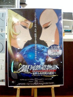 上映時間30分前には劇場へ行ったのですが、ロビーには大きなお友達がわんさかいらっしゃいました。失礼ながら銀鉄は女性ファンが多いのかと思ってましたが、男女比率7対3くらいで圧倒的に男性が多かったです。ちょっと意外でした。ただ、年齢的にはモロに999世代?でしたね。平均年齢、非常に高めでした。ま、私も人のことは言えませんが。(笑)