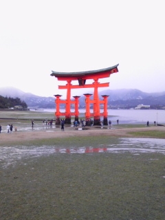 右の写真は、毎年恒例の宮島詣でで撮りました大鳥居です。神社のある入江は遠浅なので、干潮時には鳥居の足下まで行けます。人も写っているので、どんだけこの鳥居がデカイかお分かり頂けるかと思います。 マジでデカイですよー。台風に見舞われて、国宝の社殿が大損害を受けても、この鳥居は倒れないんだから、スゴイです。 ちなみに固定されていません。砂の上に立ってるだけです。