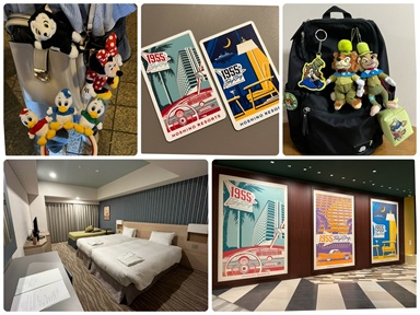シャトルバスにてホテルへ移動し、夜9時半頃チェックイン。 ホテル内のLAWSONにてそれぞれ夜食と朝食を調達し部屋へ。 今回泊まるホテルは1955東京ベイby星野リゾート。 古き良き時代のアメリカがテーマになっているようで、 原色カラーが多く使われ、お洒落でテンションが上がりました。 部屋は広くはありませんが、寝るだけなので充分満足。 それぞれ食べたいタイミングで食べたいものを食べ、 お風呂に入ったり、寝る用意をしたり、すべてがスムーズでした。