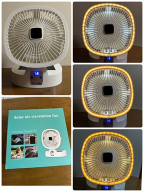 怪しい荷物だと思っていたサーキュレーターは、 桜からだったと分かり、先日やっと開封しました。 電源がUSBからだけかと思いきや、 ファンを立ち上げた後ろ側に大きめのパネルがある、 ソーラータイプでした。 左右の動きはありませんが、ファンは角度が付けられ、 風力は5段階。 さらに、ファンの縁が3段階のライトになるという、 優れものでした。 ソーラーだからコードレスで使えるし、 災害時も屋外でも利用できるという、 あたし好みのものでした。 冬場は室内干しした洗濯物にも使えそうだし、 年中、活躍してくれそうです。