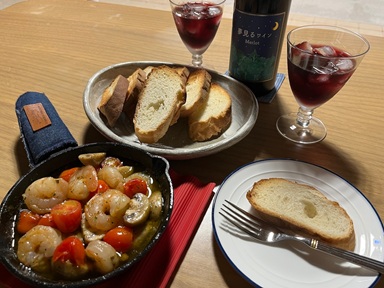 最近、以前より桃と夕食を食べることが多いです。 今日は前に買っておいたアヒージョの素を使いたくて、 ミニトマトとマッシュルームを買ってきました。 ふるさと納税で買った特大むきえびもまだあるので、 それを使ったら豪華なアヒージョになりました。 桃が作ってくれたので、 あたしはバケットを切ったり焼いたり、 頂き物の赤ワインを用意したりと、 二人の連携は素晴らしいものです。 ちょっと気取った軽めの夕食ですけど、 こんな時間が愛おしく感じます。