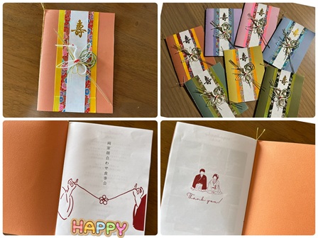 今日のために桃は、色とりどりのしおりを作成。 そういうテンプレートがあるそうですが、 用紙や鶴の飾りや紐を選んだり買ったり、 誰にどの色にしようか迷ったり。 中身は数ページ分あり、 自分たちのプロフィールと、家族の自己紹介、 二人の馴れ初めや写真などがおさめられていました。 大変そうではありましたが楽しんで作っていました。