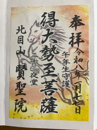 午年の守り本尊だけあって、 午の絵が描かれているお守りなど、 在庫がなくなるほどだと新聞にもありましたが、 あたしたちは御朱印をいただくだけにしました。 初穂料は300円。 今どき300円はお安い。 住職が法要中とのことで書き置きになりました。 午の絵が縁起良さそう。