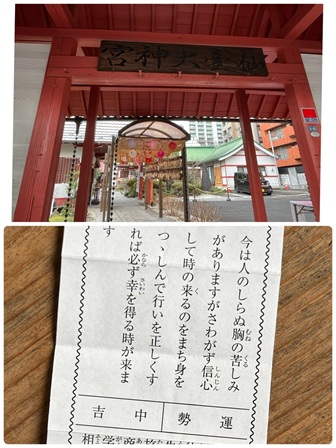 今日のお詣りは最後の神社なので、 おみくじを引きました。 中吉でした。 大日如来での初詣の時は、珍しい半吉でしたから、 少しだけ上向いたということになるのかな。 御朱印もいただきました。 初穂料は500円。