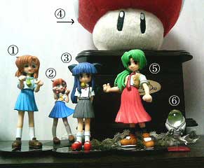 1.レナ(顔パーツ:かぁいいモード) 2.レナ(ガチャのやつ) 3.梨花ちゃま(三種の神器装着) 4.有名なあのキノコ 5.魅音(顔パーツ:笑顔) 6.白坊主