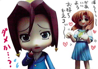 世界一かわいいおねだり顔に思わずレナもメロメロなんだぜ! この表情をチョイスしてくれた方に、心からお礼申し上げます 口元に添えたひとさし指とか可愛すぎる… ネウロは猫被ってても脱いでても可愛くて困ります この顔とポーズのまま飾ろうと思いましたが、顔に指の塗料が移りそうだったのでやめました 伸ばした腕だと台座(スタンド?)にはめるの難しかったし… でも、台座はデスノのに比べてかなりいい感じになってますね! ヤコも固定しやすくてよかったです ただ、ヤコのアホ毛とネウロの前髪(真ん中の)には要注意ですな ネウロの毛は表情パーツ替える時に早速ヘシ折りました 危ないな〜とは思っていたのですが、パーツが固くてなかなか外れず、 エイヤッと引っこ抜いた衝撃であっという間に… 仕方ないから接着剤でくっつけたけど、割と不安です まぁ激しく遊ぶ気はないのでいいんですけどもね さて、次のねんどろいどはKAITOだよー!これも楽しみだよー!