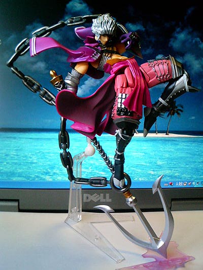 正直この商品最大のウリであろう鎖は言うほどの保持力はなく、 腰の前垂れ(?)はキャストオフでも出来んのかというほどポロポロ外れますが、 そんなのは可動フィギュアである以上仕方ない事ですし、 そもそもセールで買ったものなので全然気にせずガッシガシ動かしてます 既に首のジョイントはズレて外れましたしね 右股関節も凄い取れる でもかっこいいからいいのです(はぁと)