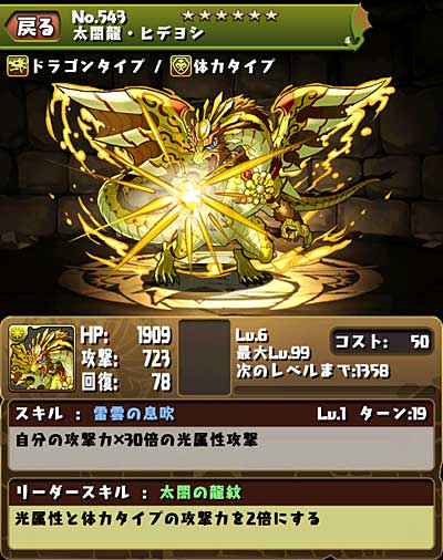 とれました!んふふ キンキラキンのゴージャス竜! 今回は私みたいな弱小パーティでも超級ノーコンです これで戦国シリーズはシンゲン獲ればコンプ! 次に巡ってきたらぜってぇ獲る その時のために攻略パメモしとく 緑おでん、ギガンテス、ノブナガ、ネッキー、セイレーン とイシス