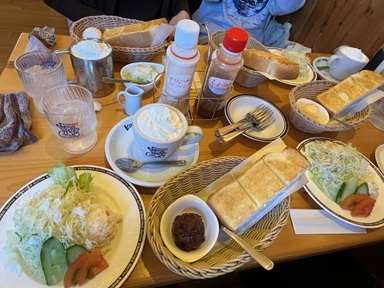 朝7時過ぎに3人を迎えに行き、コメダ珈琲店にてモーニング。 全員厚切りトーストをチョイス。 桃と母は卵ペースト、桜はゆで卵、あたしはおぐらあんをチョイス。 桜はコールスローサラダ、他3人はミニサラダをプラス。 あたしと桃はウインナーコーヒーのホット、 桜はウインナーコーヒーのアイス、母はストレートティー。 それぞれ美味しくいただきまして、買い物をしてから実家へ。 おやつを食べながらずーっと麻雀。 ランチを挟んで、午後もずーーーーっと麻雀。