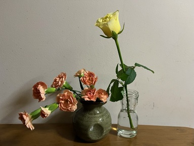 シックな色味のカーネーション。 深まった秋にぴったり。 そこへ鮮やかな黄色のバラ。 1本なので、ちょっとしたアクセント。