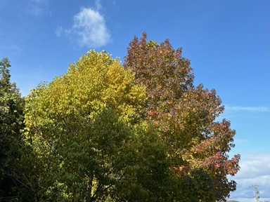 今年はちゃんと紅葉狩りに行けずにいます。 熊が怖くて。 これ、本当の話です。 でも市内のあちこちの紅葉もとても綺麗。 この写真は我が家の階段を下りる際、 目の前にそびえている落葉樹。 確か、先週の土曜日あたりに撮ったのですが、 青空に映えています。 わざわざ行かなくても、身近で楽しめます。